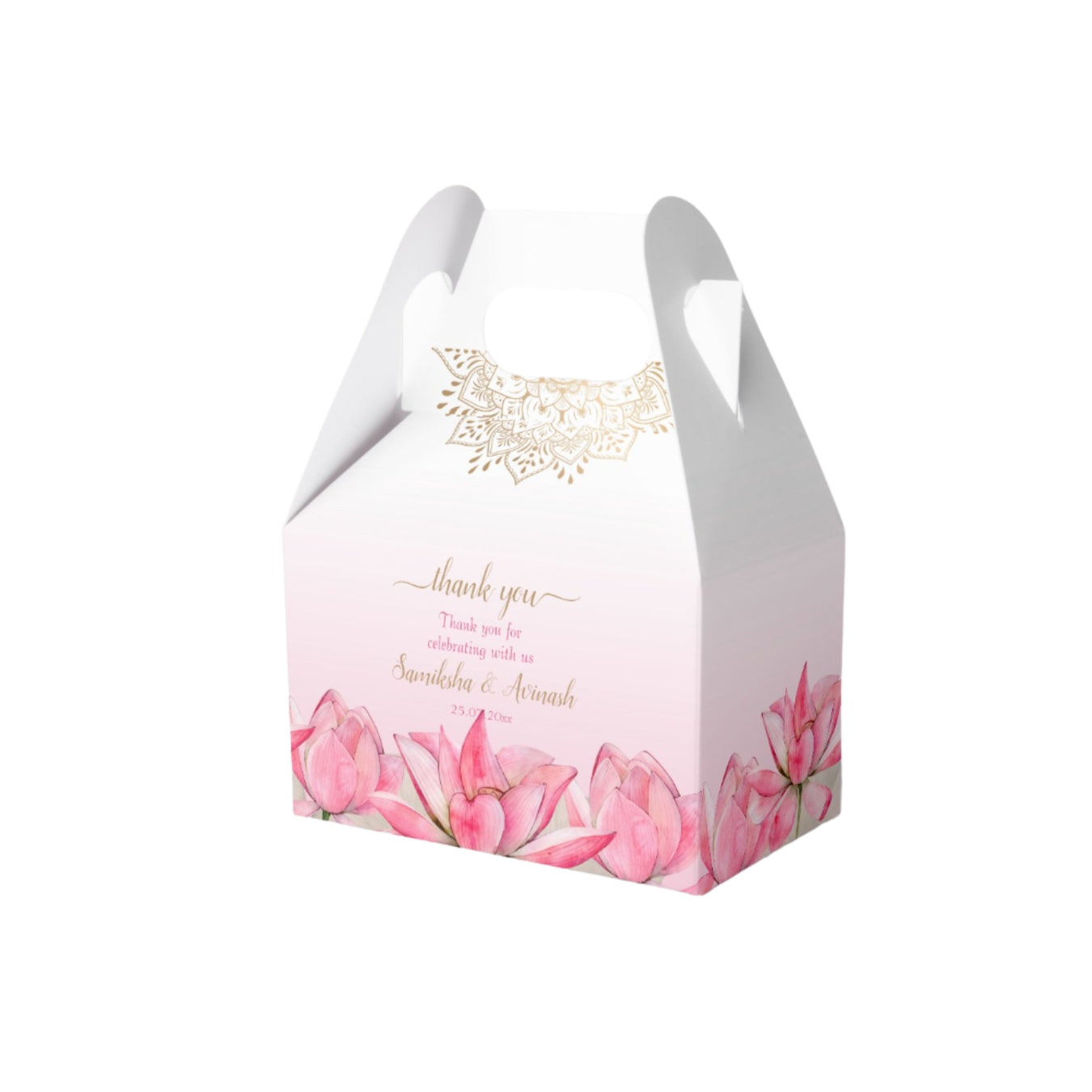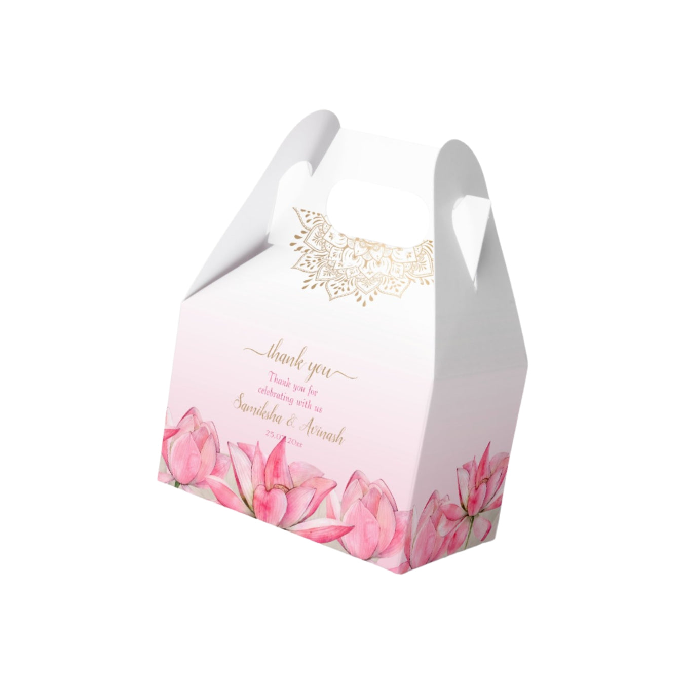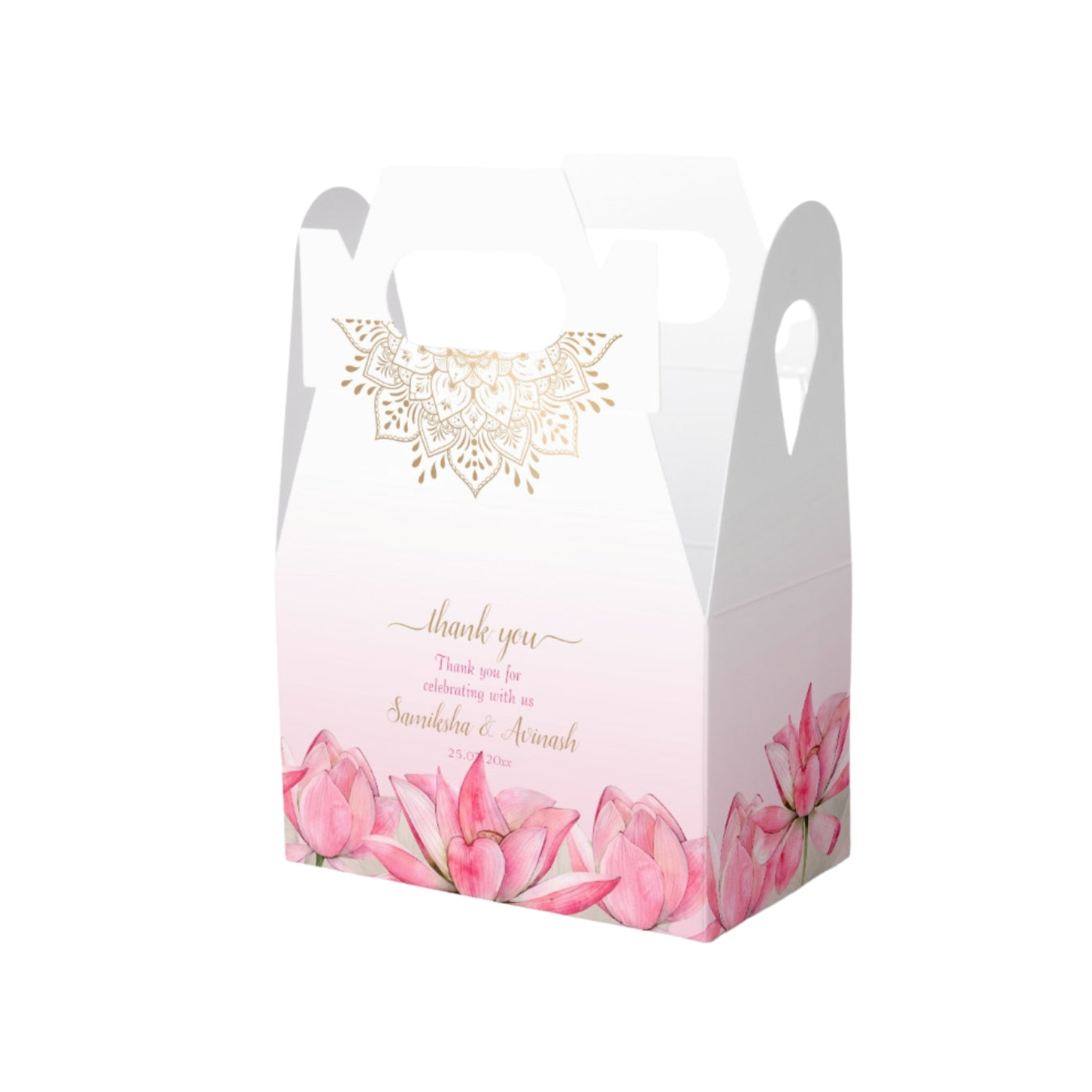 We at Instaprint made these bid boxes with pink flowers on the bottom and white handles. The box is light pink that gets whiter toward the top with gold text in the middle. The tulips look nice and the handles make it easy to carry during the baraat ceremony when families are giving away the Bid favors. The pink color works for most Pakistani weddings and doesn't look too fancy or overdone. Good for the traditional ceremony when the groom's side showers the attendees with favors