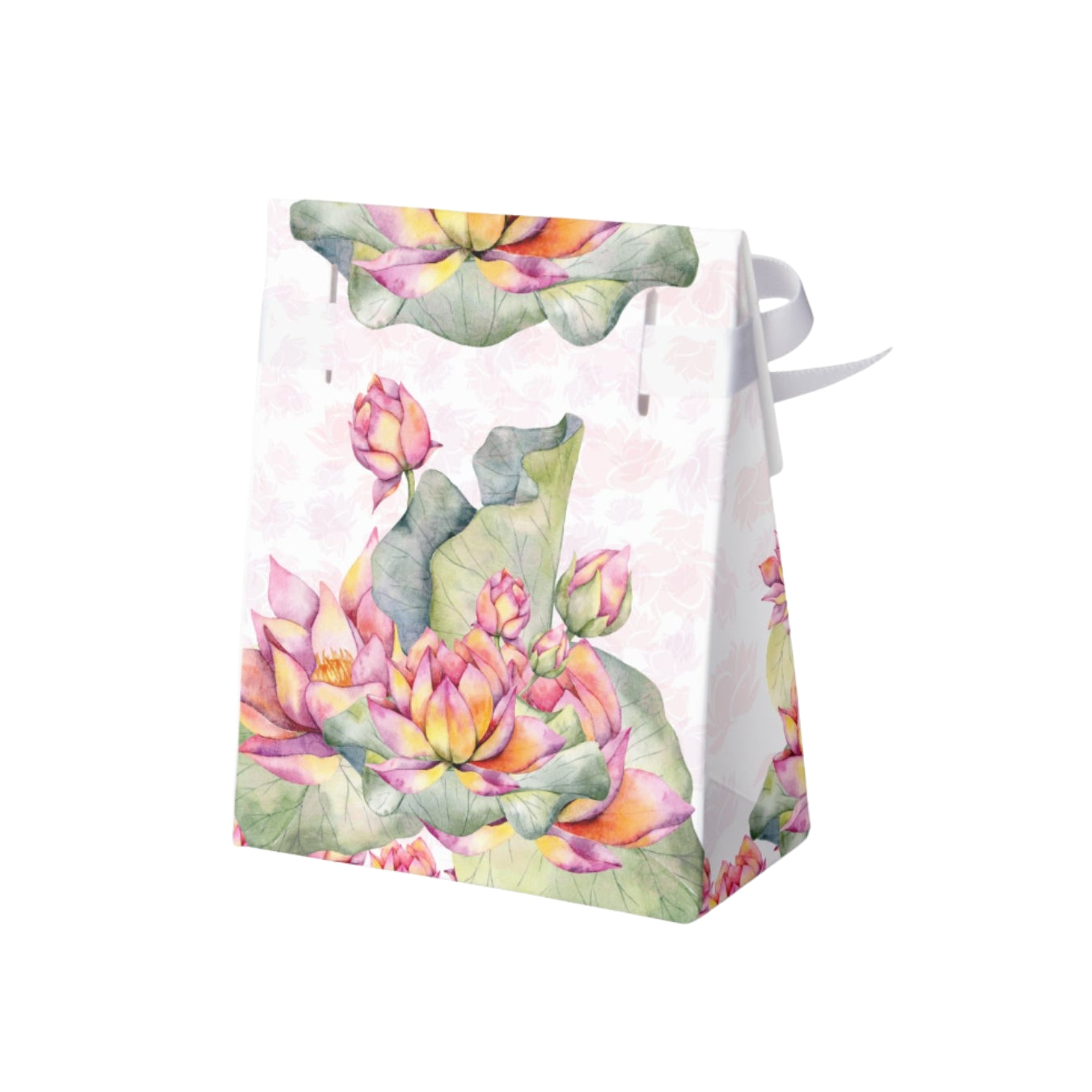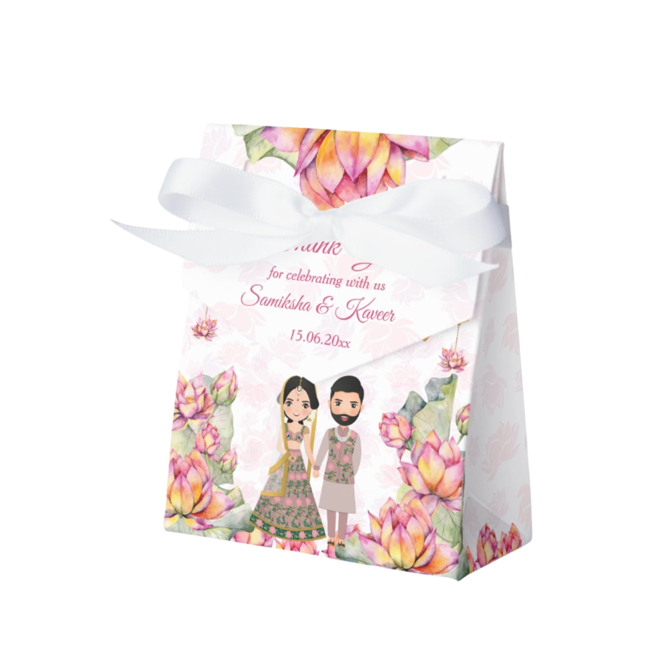 Elegant Floral Bid Boxes with cute illustrations for the ceremony. The white box has bright pink and orange flowers all around it with a little bride and groom in the middle. The colorful floral design makes the festive ritual more fun and lighthearted, especially when the families are joking around during negotiations. The box has fold-over flaps that keep everything secure inside while people are passing it back and forth. This style works well for younger couples who want something cheerful and modern instead of the traditional formal look during their baraat ceremony.
