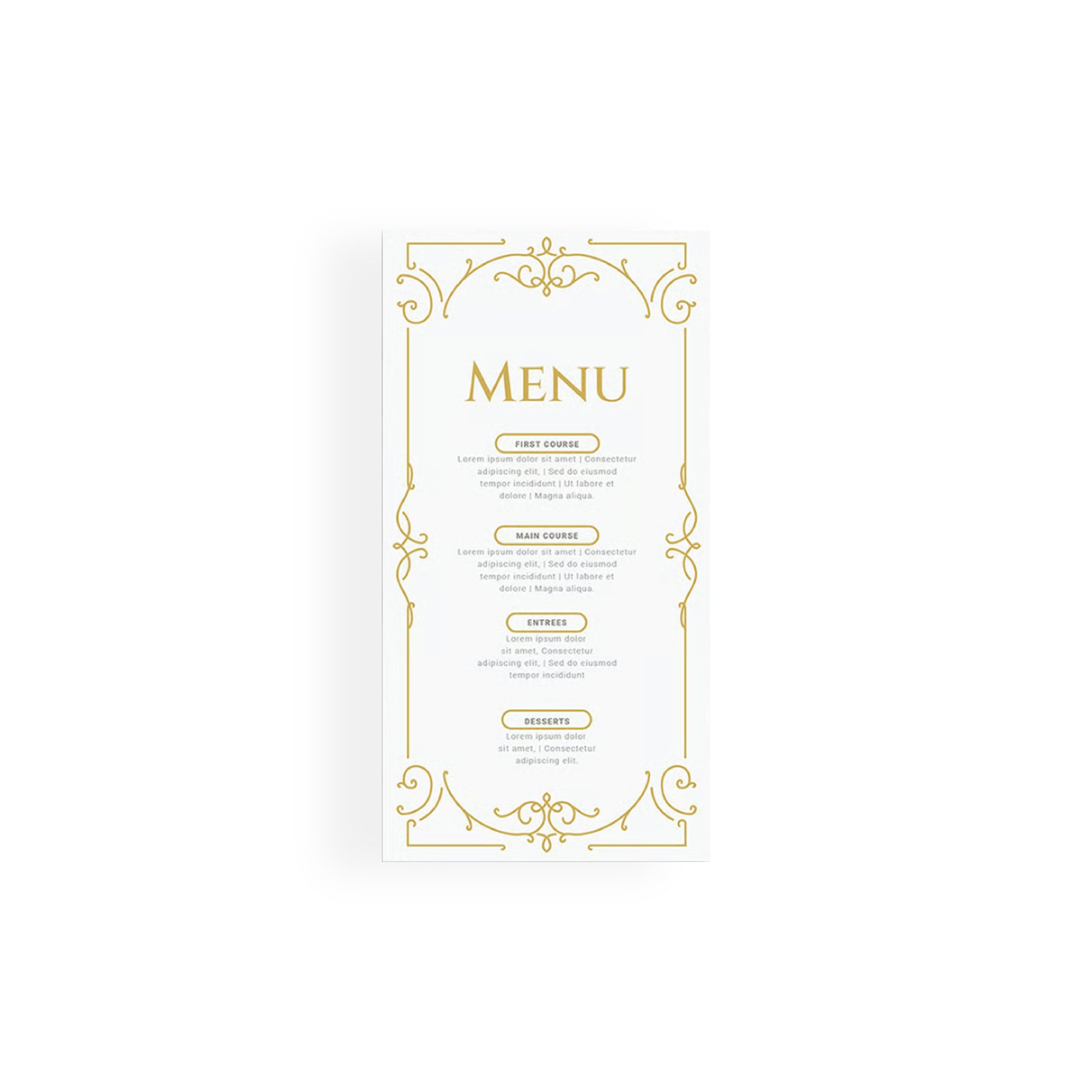 Menu card with gold scrollwork borders and Victorian decorative flourishes at corners. Features classic gold "MENU" lettering with oval section labels for first course, main course, entrees, and desserts. White background contrasts with ornamental gold details that frame the content completely.
