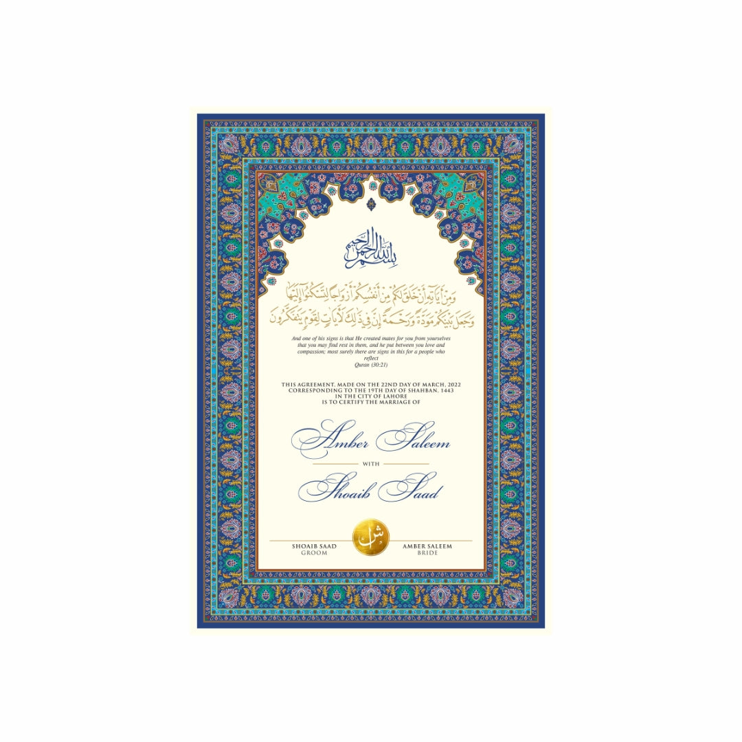 This Royal Heritage Nikkah Certificate got rich blue and teal border with lots of patterns. The design shows Arabic writing on top, English text below on a cream color background. Fancy floral and geometric stuff fills the colorful border like traditional carpet designs. You can put the couple names and wedding info in nice script writing. The certificate has a golden seal and places for witnesses to sign. Design uses old Islamic art with deep jewel colors. Good for couples wanting a formal traditional look with royal colors and detailed work.