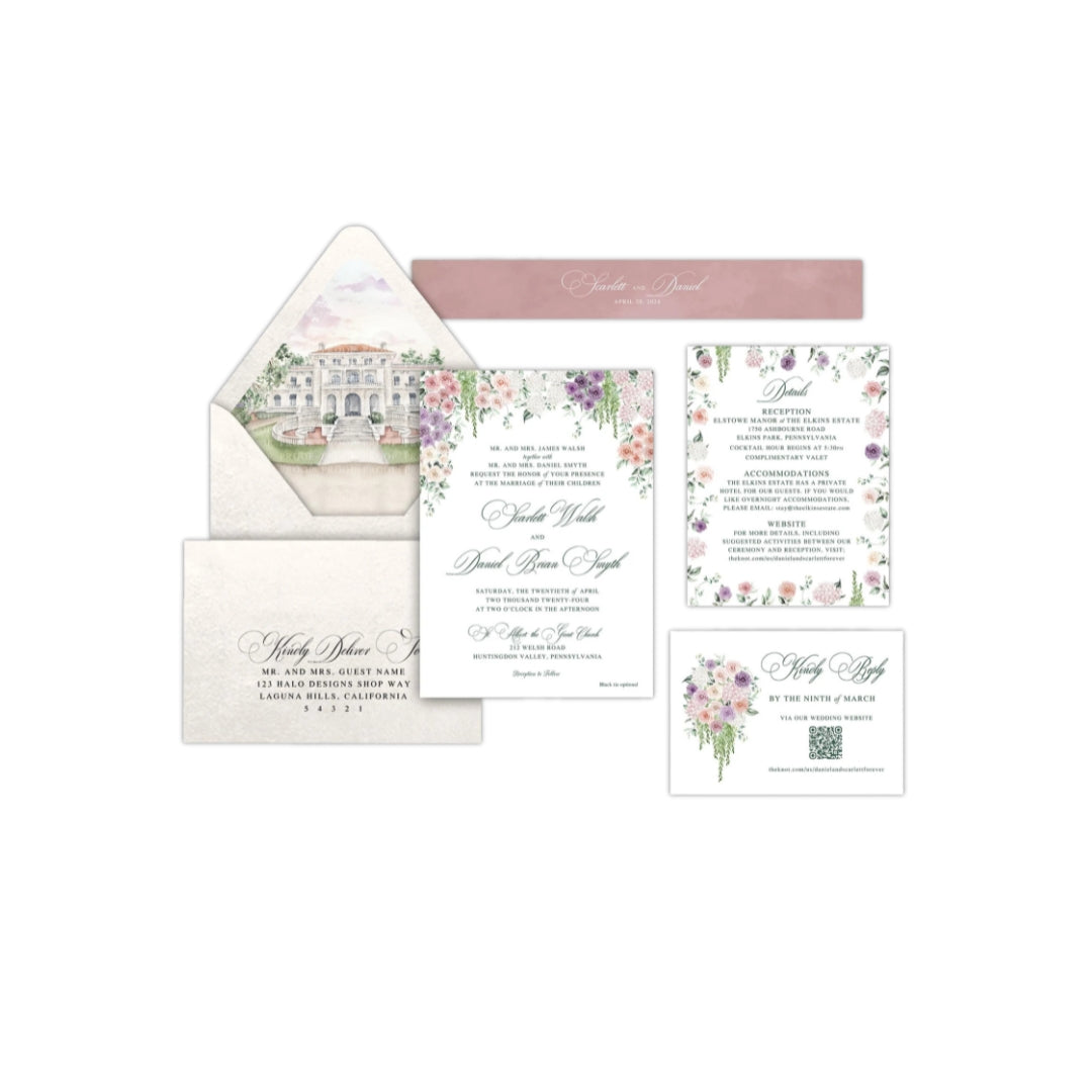 This gorgeous wedding invitation set will make your guests excited before they even open the envelope. The soft purple and pink watercolor flowers give it such a dreamy, romantic feel - perfect if you're planning a garden wedding or just love floral designs. You get the main invitation, RSVP card, and matching envelope with that beautiful floral liner and dusty rose band detail.