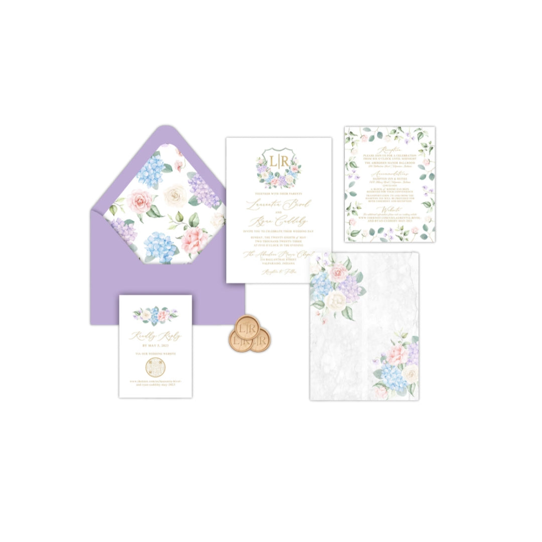 Lavender wedding card set with watercolor botanical designs in blue, pink, and green florals. Includes main invitation, RSVP card, and purple envelope with floral liner. Features elegant script typography and coordinating wax seals. Customizable text for your wedding details. High-quality printing on premium cardstock with full-color wraparound printing. Complete coordinated package perfect for spring or garden weddings. Professional presentation with romantic floral elegance. All components designed to match for a cohesive wedding stationery suite. Premium materials and printing quality ensure a lasting impression for your special day celebration.