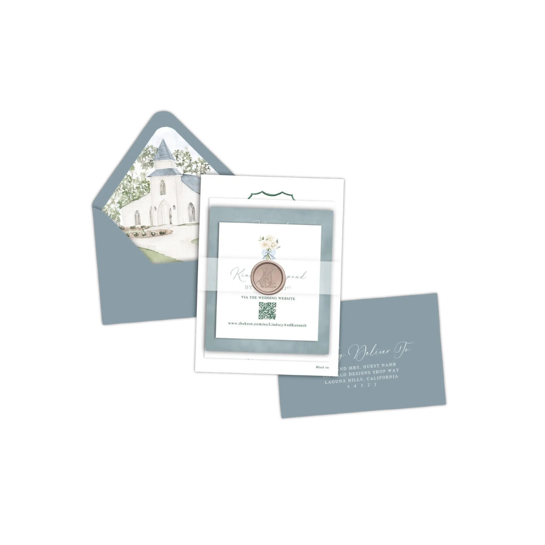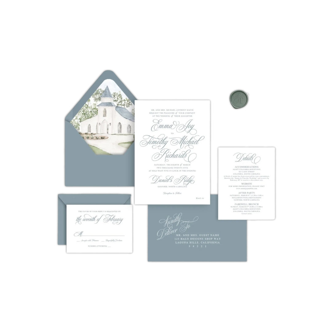 Complete wedding card set in dusty blue and cream with floral details and elegant script fonts. Includes main invitation, RSVP card, and insert cards. High-quality printing with customizable text for your wedding details. The coordinated design creates a cohesive look for your special day. Features wraparound printing for professional presentation.